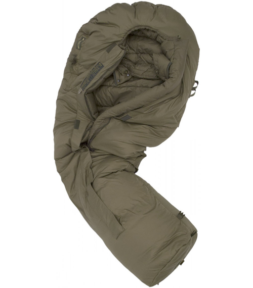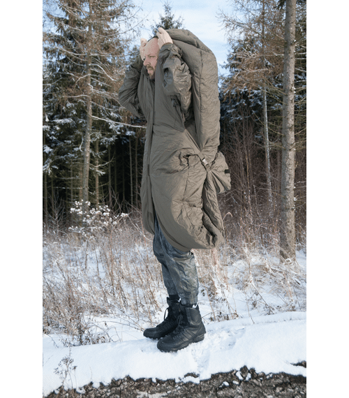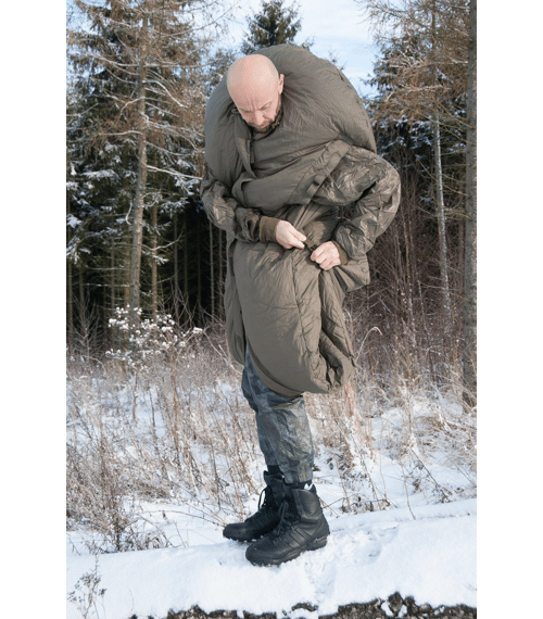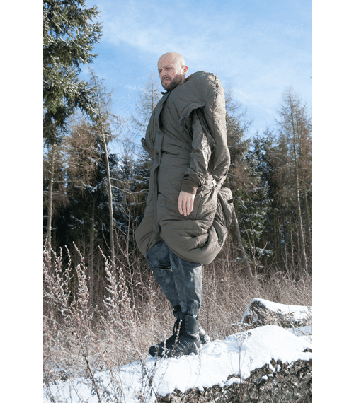 • Durch Drehbewegungen wird zwar die innere Isolierschicht komprimiert, dennoch bleibt der Loft der äußeren Lagen und die Isolierfähigkeit voll erhalten. Das Schlafsack-Unterteil kann hochgeklappt werden, der Schafsack wird zu einem Mantel und man kann sich bewegen. Die Ärmel, die sich zwischen den Isolierschichten befinden, können herausgenommen werden.