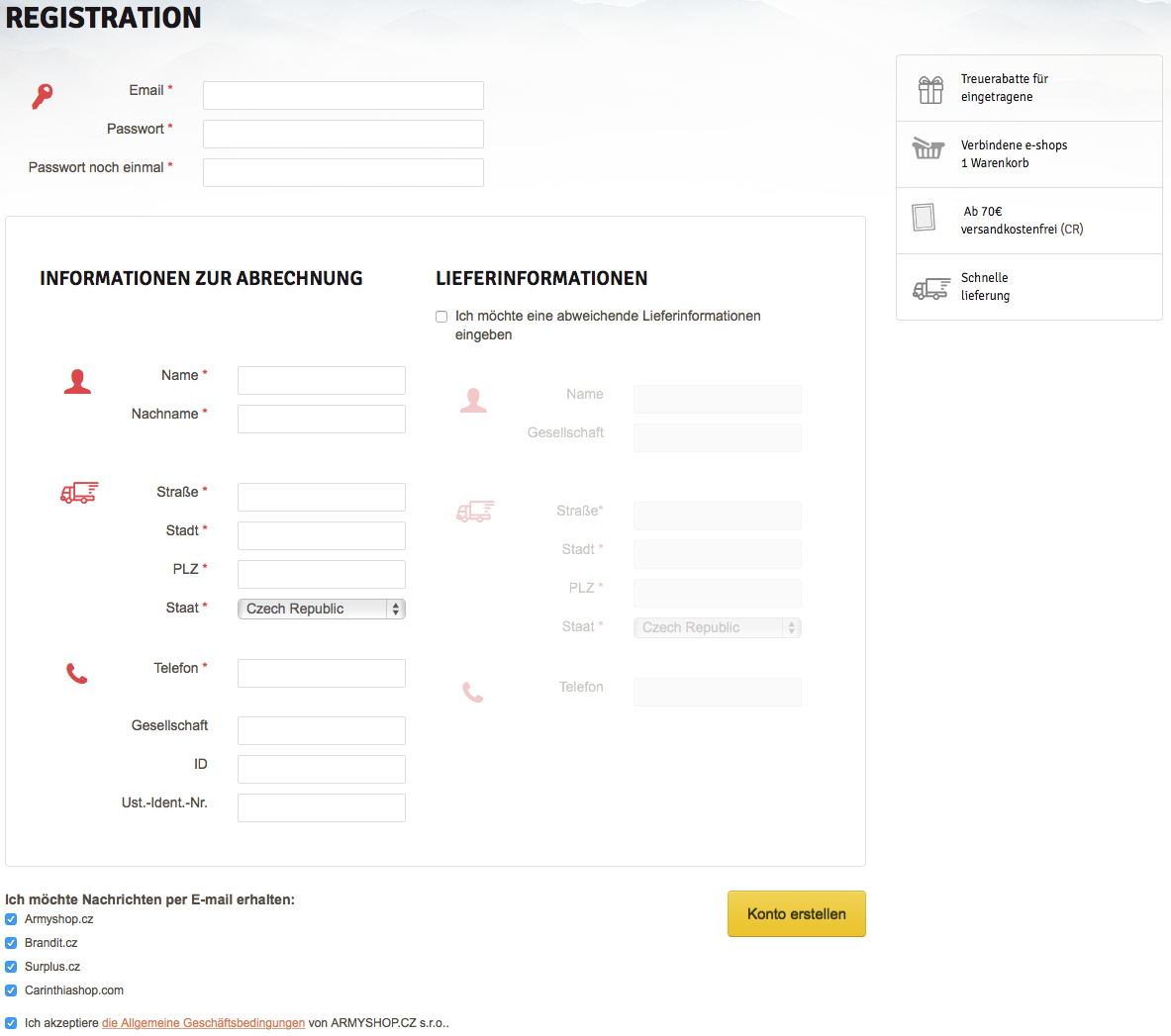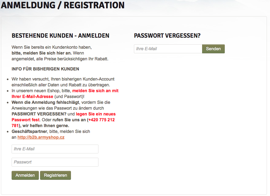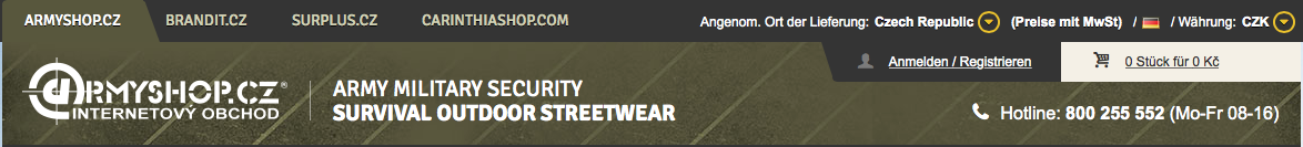 Wenn Sie in einem unserer früheren E-Shops unter den Domänen ARMYSHOP.CZ, SURPLUS.CZ, BRANDIT.CZ und/oder CARINTHIASHOP.COM registriert wurden, benutzen Sie als Benutzernamen nicht mehr Ihr ursprüngliches Login, sondern jene E-Mail-Adresse, die Sie als Kommunikationsadresse bei der Registrierung angegeben haben. Sie können dasselbe Passwort benutzten wie bis jetzt.