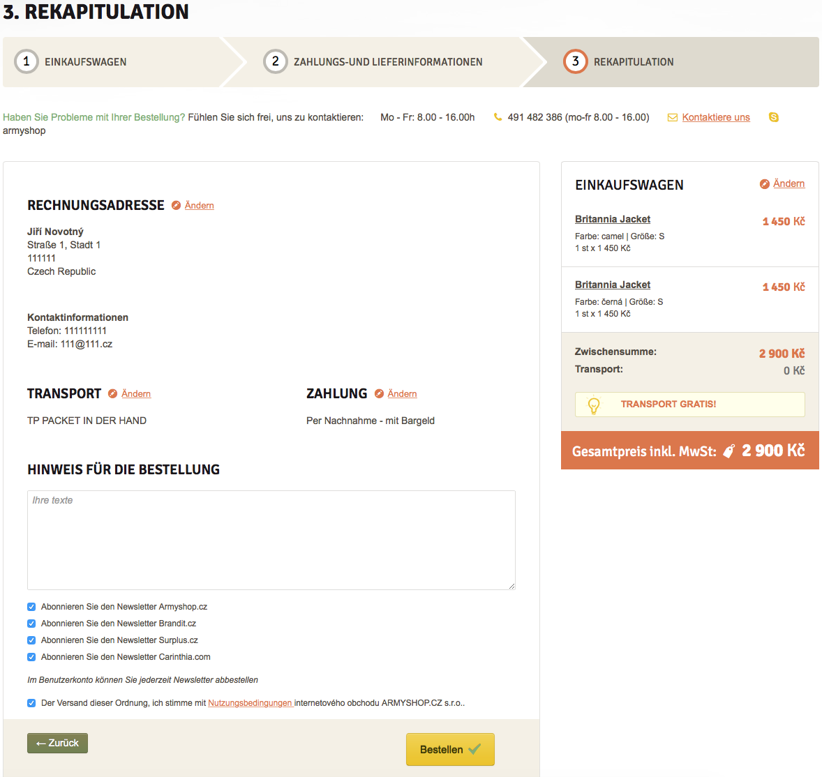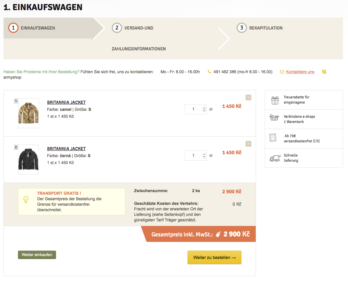 Mit dem Button Warenkorb edieren kommen Sie zum ersten Schritt des Bestellvorgangs: 1.INHALT DES WARENKORBS. Hier haben Sie die Möglichkeit die Stückzahlen der Artikel zu ändern, mittels Löschkreuz in der rechten Ecke oben den Artikel löschen oder durch den Klick auf Weiter shoppen noch weitere Artikel in den Warenkorb zu legen. Nach allen oben erwähnten Änderungen wird der Warenkorb automatisch neu berechnet. Sind Sie mit der Wahl der Artikel zufrieden, können Sie Zur Kasse gehen.