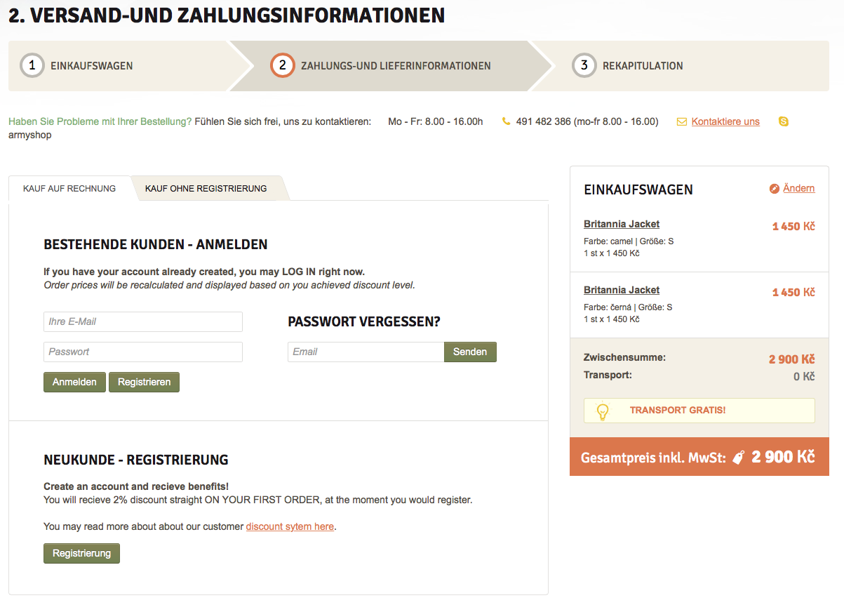 Der zweite Schritt des Bestellvorgangs ist Punkt 2. VERSANDANGABEN UND ZAHLUNG. Hier haben Sie folgende Möglichkeiten: entweder können Sie Ihre Bestellung ohne Registrierung abwickeln (OHNE REGISTRIERUNG BESTELLEN) oder Sie können sich in Ihr Kundenkonto anmelden und auf Ihr Konto einkaufen.