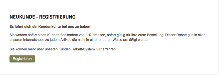 Wenn Sie unser Internetshop zum ersten Mal besucht haben und möchten sich hier registrieren, klicken Sie auf Button Registrieren im zweiten Teil des Anmeldevorgangs NEUKUNDE – REGISTRIERUNG.