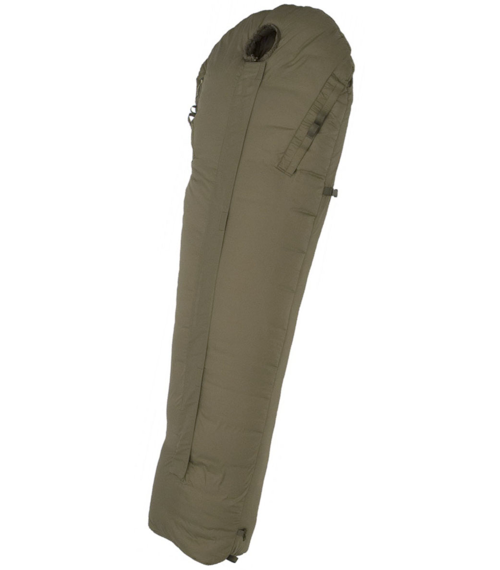 This high performance winter sleeping bag was especially designed for military use. It has generous draft tubes on the inside of the zipper to prevent any heat loss there. Anti-snag tape along the zipper and a protection flap on the outside keep out wind and wetness. The SURVIVAL ONE has a differential cut which means that each successive insulating layer is cut more generously. This ensures the greatest possible loft in all areas and in every sleeping position. Movement inside the sleeping bag creates pressure points but with our differential cut only the innermost layer is compressed. By opening the zipper at the bottom you can get your feet out if you want to step outside. You can tie up the foot end so that you can walk and even wear the bag like a coat. The sleeves are stored between the insulation layers.