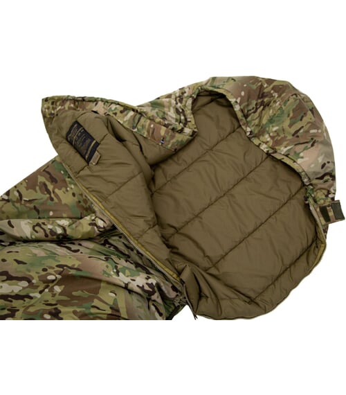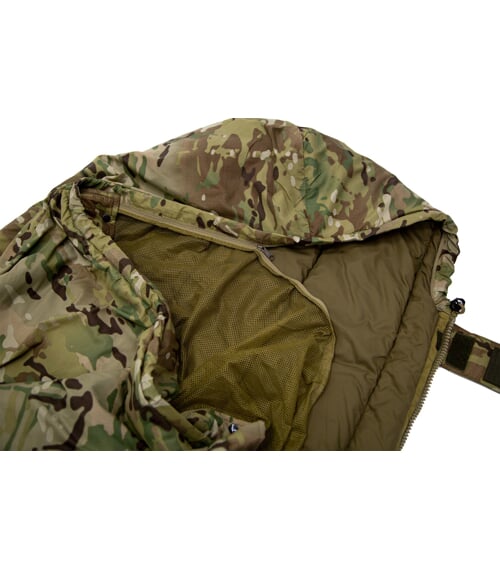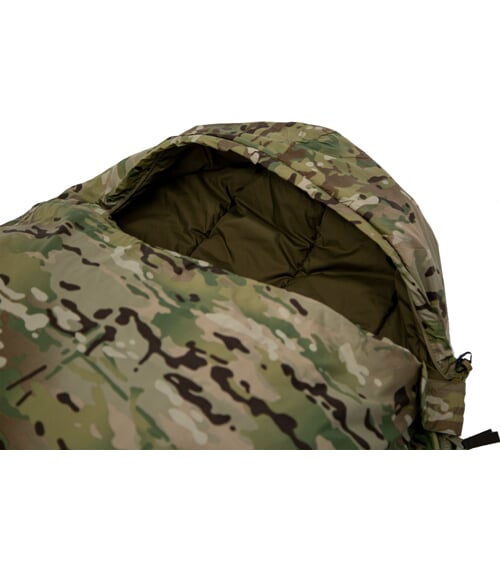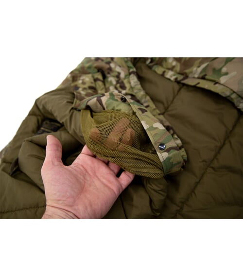 This construction ensures reserve warmth for cool, foggy nights. In warmer weather the bottom part of the two-way zipper can be opened for ventilation. The hood is equipped with a mosquito net which can be folded out of the flap if required (it is in the front part of the bag and stored behind the flap with press studs.) The net can easily be attached around the hood by means of the small zipper. The zipper is non-snagging so that you can always get out quickly and easily.